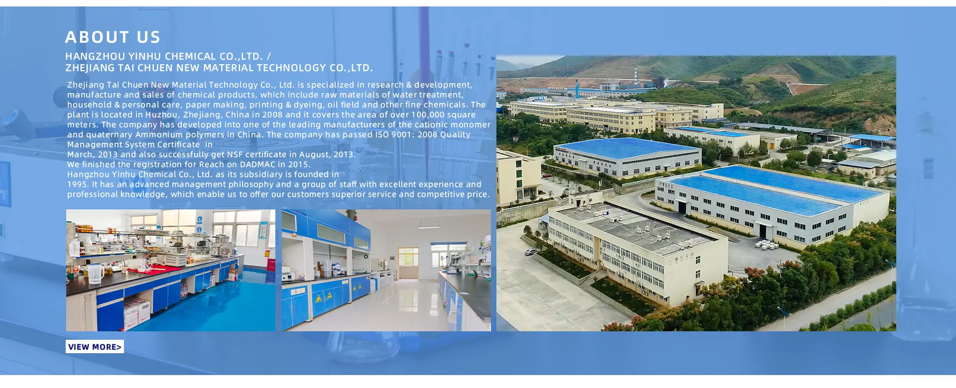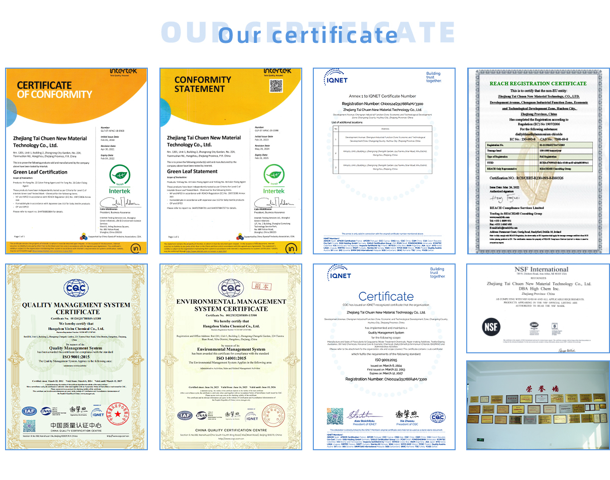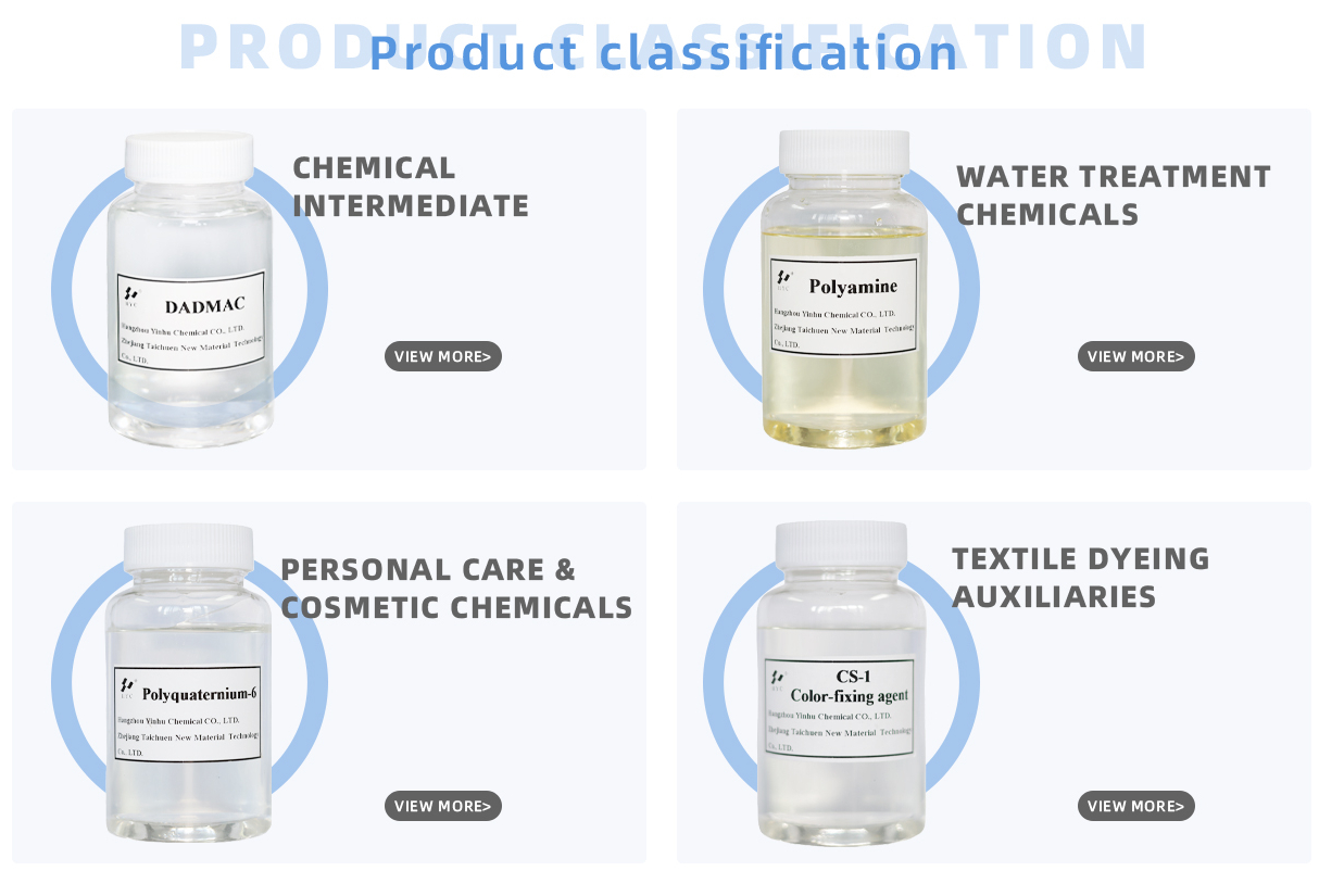 Zhejiang Tai Chuen New Material Technology Co., Ltd. is specialized in research & development, manufacture and sales of chemical products, which include raw materials of water treatment, household & personal care, paper making, printing & dyeing, oil field and other fine chemicals. The plant is located in Huzhou, Zhejiang, China in 2008 and it covers the area of over 100,000 square meters. The company has developed into one of the leading manufacturers of the cationic monomer and quaternary Ammonium polymers in China. The company has passed ISO 9001: 2008 Quality Management System Certificate in March, 2013 and also successfully get NSF certificate in August, 2013. We finished the registration for Reach on DADMAC in 2015. Hangzhou Yinhu Chemical Co., Ltd. as its subsidiary is founded in 1995. It has an advanced management philosophy and a group of staff with excellent experience and professional knowledge, which enable us to offer our customers superior service and competitive price.